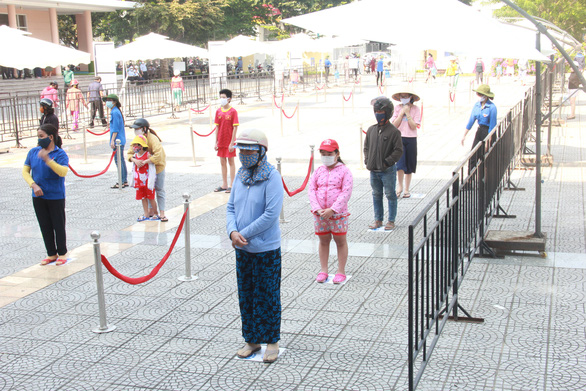 Vị trí trước máy “ATM gạo” được tổ chức để đảm bảo giãn cách chống dịch COVID-19. Ảnh: báo Tuổi Trẻ