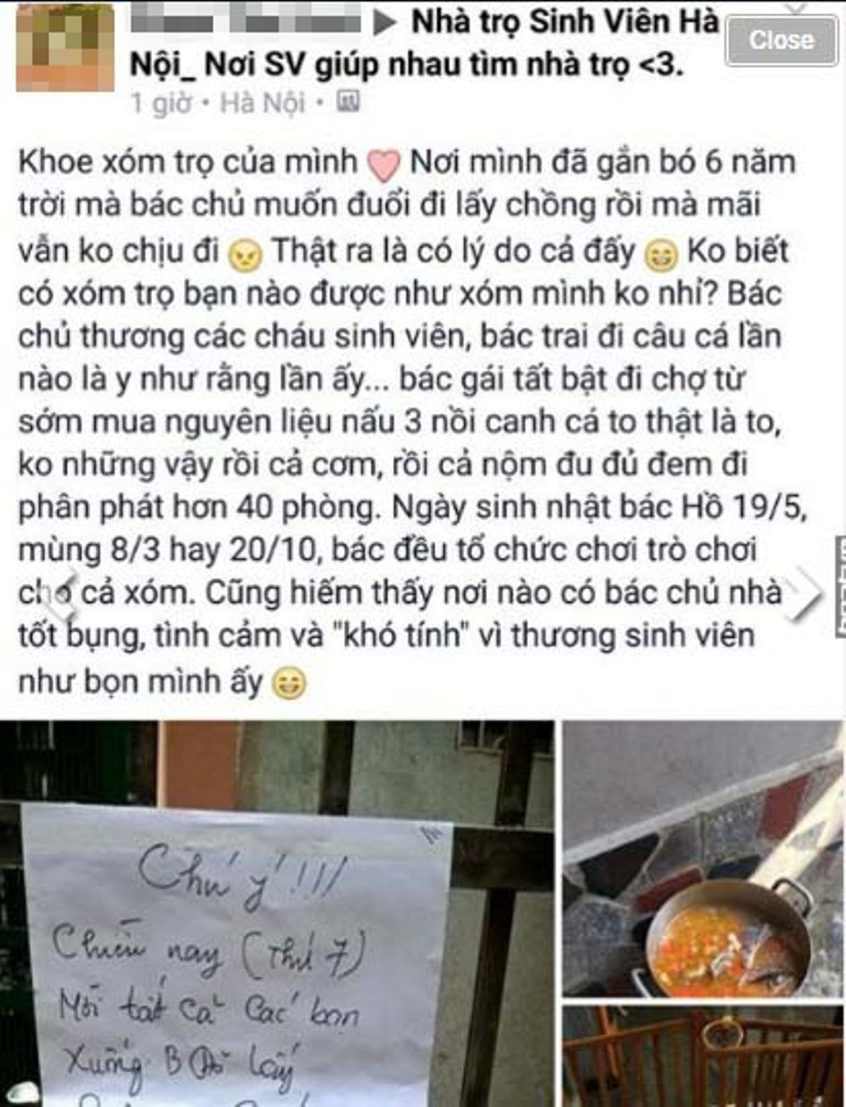 Ngày sinh nhật Bác Hồ (19/5), mùng 8/3 hay 20/10 bác đều tổ chức trò chơi cho cả xóm. Cũng hiếm thấy nơi nào bác chủ nhà tốt bụng, tình cảm và “khó tính” vì thương sinh viên như khu trọ của bọn mình ấy”, nickname H. từng gây bão mạng khi kể về câu chuyện bác chủ trọ mà bạn ấy đã thuê phòng suốt 6 năm qua.
