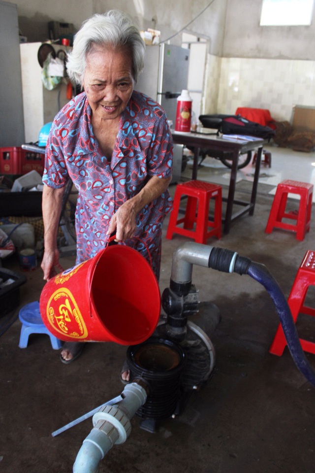Việc cho nước người dân xài vừa tốn tiền điện vừa vất vả nhưng bà Hưởn cảm thấy vui khi chia sẻ những lít nước ngọt cho người dân giữa mùa hạn mặn khắc nghiệt.