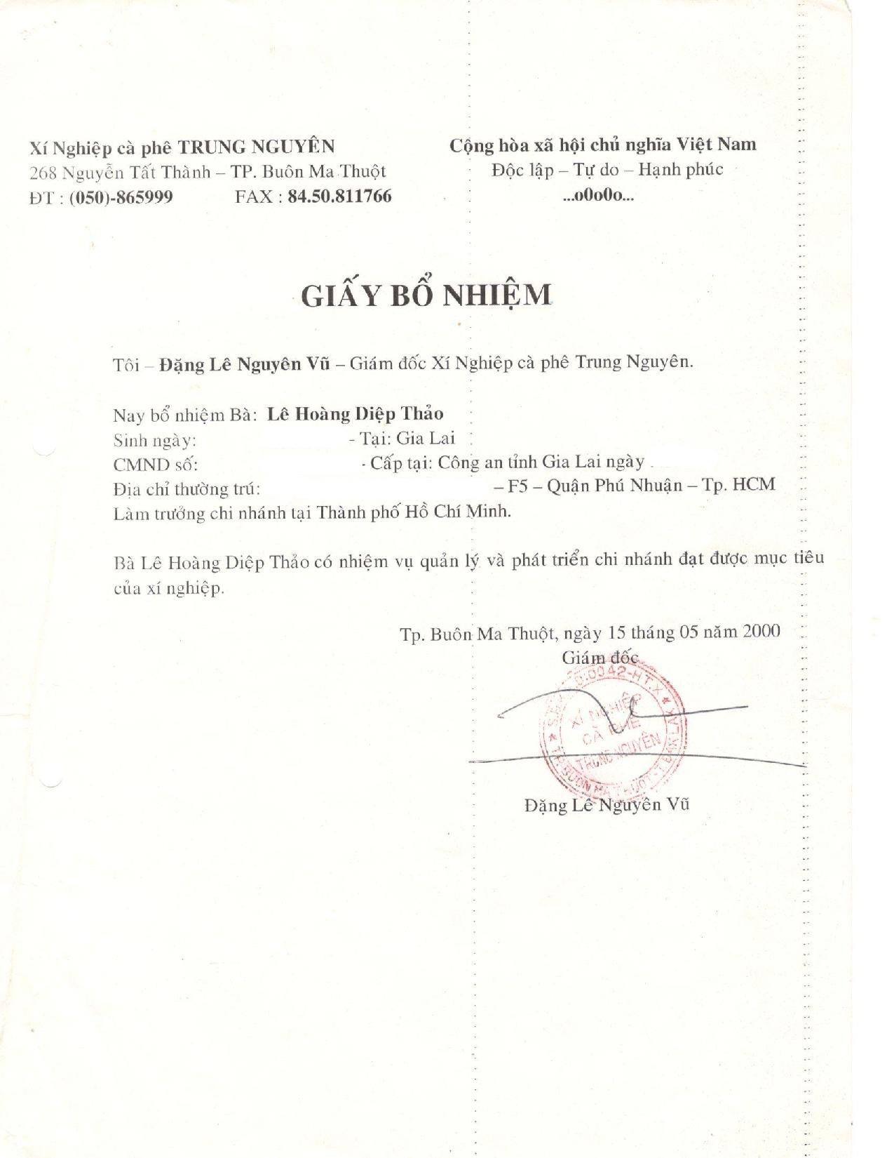 Giấy bổ nhiệm bà Thảo làm Trưởng Chi nhánh Hợp tác xã Xí nghiệp Cà phê Trung Nguyên tại TP.HCM năm 2000. Ảnh: FBNV