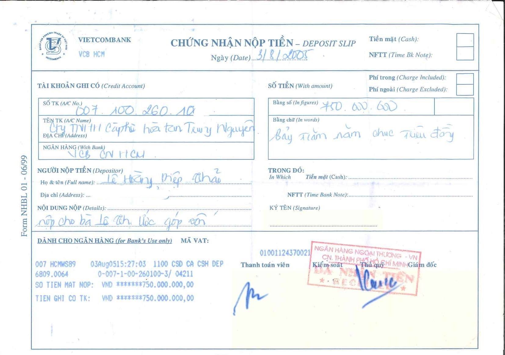 Một trong những chứng từ góp tiền vợ chồng ông Vũ đóng cổ phần cho ba má chồng để báo hiếu. Ảnh: FBNV