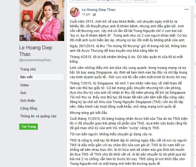 Tiếp theo diễn biến vụ ly hôn vợ chồng ông chủ Tập đoàn Trung Nguyên, mới đây trên trang Facebook của bà Lê Hoàng Diệp Thảo, vợ “Vua cà phê” tiếp tục có những chia sẻ về sức khỏe tâm thần của ông Đặng Lê Nguyên Vũ. Đồng thời bà Thảo cũng tiết lộ những sóng gió phải đối mặt khi điều hành công ty con của Trung Nguyên tại Singapore.