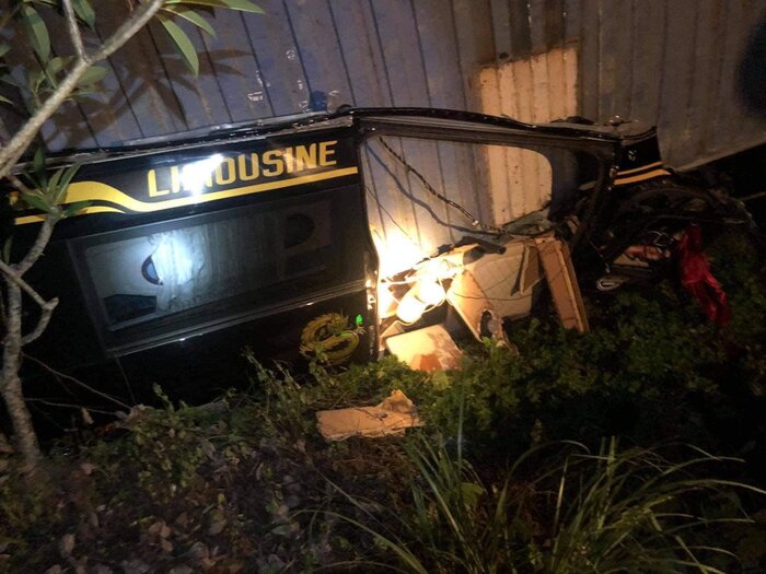 Xe Limousine bị container đè bẹp. Ảnh: Otofun