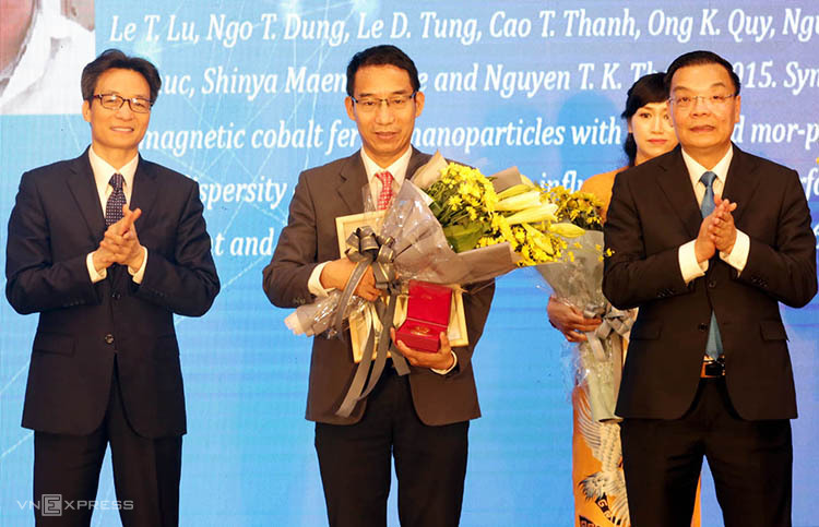 Phó Thủ tướng Vũ Đức Đam (bìa trái), Bộ trưởng Chu Ngọc Anh (bìa phải) trao giải cho ba nhà khoa học.