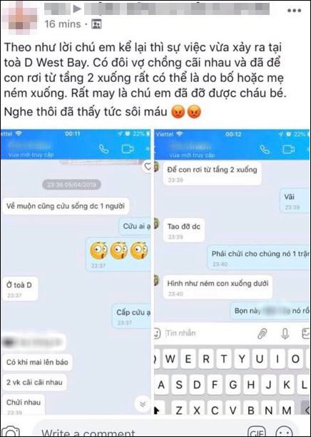 Có đôi vợ chồng cãi nhau và đã để con rơi từ tầng hai xuống đất rất có thể là do bố hoặc mẹ ném xuống. Rất may là chú em đã đỡ được cháu bé. Nghe thôi đã tức sôi máu.”
