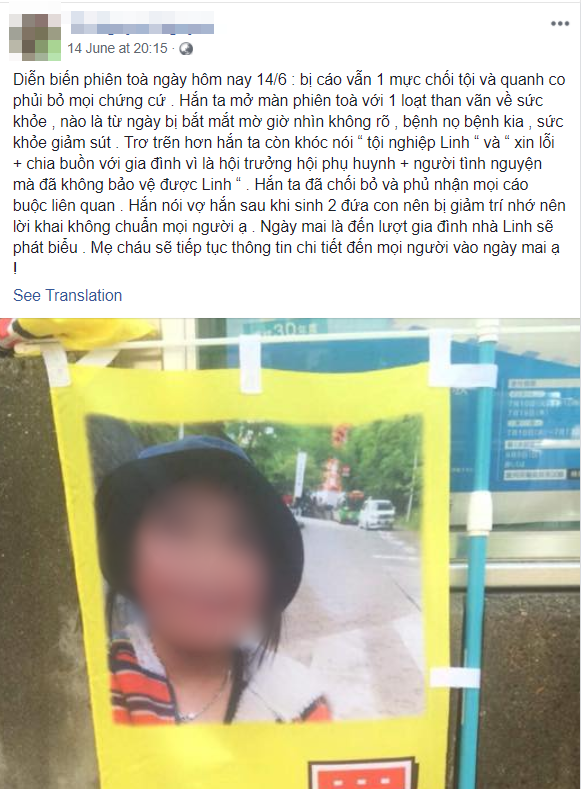 Trên trang cá nhân, chị Nguyên chia sẻ: “Hắn ta mở màn phiên toà với 1 loạt than vãn về sức khỏe, nào là từ ngày bị bắt mắt mờ giờ nhìn không rõ, bệnh nọ bệnh kia, sức khỏe giảm sút. Trơ trẽn hơn, hắn ta còn khóc nói “tội nghiệp Linh” và “xin lỗi + chia buồn với gia đình vì là hội trưởng hội phụ huynh + người tình nguyện mà đã không bảo vệ được Linh” . Hắn ta đã chối bỏ và phủ nhận mọi cáo buộc liên quan. Hắn nói vợ hắn sau khi sinh 2 đứa con nên bị giảm trí nhớ nên lời khai không chuẩn mọi người ạ“, chị Nguyên bức xúc.