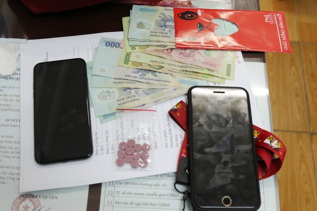 Qua kiểm tra, lực lượng phát hiện 1 bịch nilon chứa 12 viên nén màu hồng mà các đối tượng khai nhận là ma túy tổng hợp (thuốc lắc), hơn 10 triệu đồng cùng một số tang vật khác.