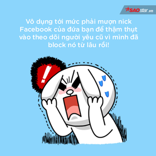 Xoá hết mọi kết bạn trên mạng xã hội nhưng vẫn âm thầm block rồi lại mở block để vào xem liệu người cũ có còn nói gì về mình hay cắn rứt về mình, có khi còn tới mức… mượn tài khoản của đứa bạn nào đó để theo dõi mà không bị phát hiện. Xem xong rồi nằm tức giận buồn khóc đủ các thể loại, như tự hành xác bản thân, không hiểu tại sao mình cứ làm như vậy như bị bỏ bùa. Kiểu mâu thuẫn thường gặp nhất trên Trái Đất này…