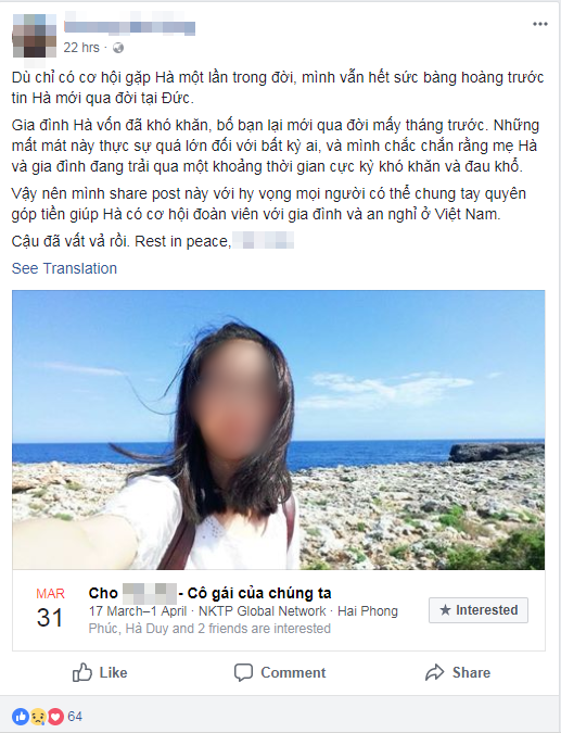 Chị T.T, một người quen của nữ sinh cũng xúc động chia sẻ: “Gia đình Hà vốn đã khó khăn, bố bạn lại mới qua đời mấy tháng trước. Những mất mát này thực sự quá lớn đối với bất kỳ ai, và mình chắc chắn rằng mẹ Hà và gia đình đang trải qua một khoảng thời gian cực kỳ khó khăn và đau khổ. Vậy nên mình share post này với hy vọng mọi người có thể chung tay quyên góp tiền giúp Hà có cơ hội đoàn viên với gia đình và an nghỉ ở Việt Nam”.