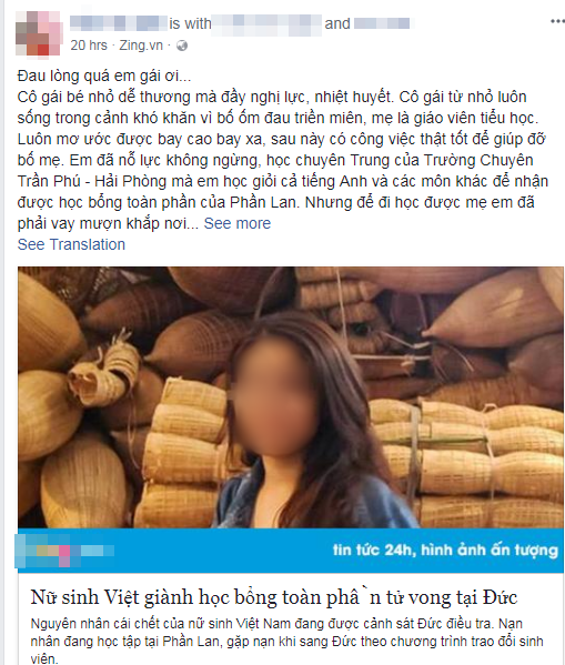 Mới đây, thông tin nữ sinh Việt Nam, bạn T.T.H - nữ sinh trường Haaga - Helia University of Applied Sciences, Phần Lan nghi bị sát hại tại Đức khiến cộng đồng mạng dậy sống. Trên facebook, chị Trần Kim Ngân chia sẻ, gia đình hiện lâm vào cảnh khánh kiệt, không đủ kinh phí sang Đức đưa thi thể em gái về quê. Số tiền này ước chừng cần 50.000 Euro (tương đương hơn 1 tỷ đồng) là một khoản phí quá lớn so với mức chi trả của gia đình chị Ngân.