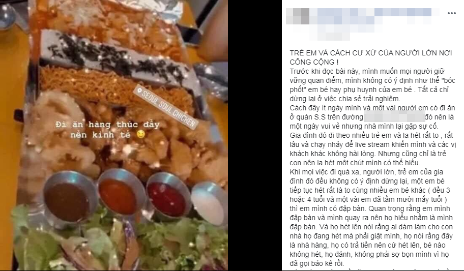Trong khi các thực khách đang ăn, nhóm trẻ em của gia đình này lại chạy nhảy, la hét rất to để livestream khiến T. và nhiều vị khách trong quán không hài lòng. Dù vậy, T. vẫn bỏ qua và cảm thông cho gia đình vì nghĩ rằng trẻ con la hét một chút là điều dễ hiểu.