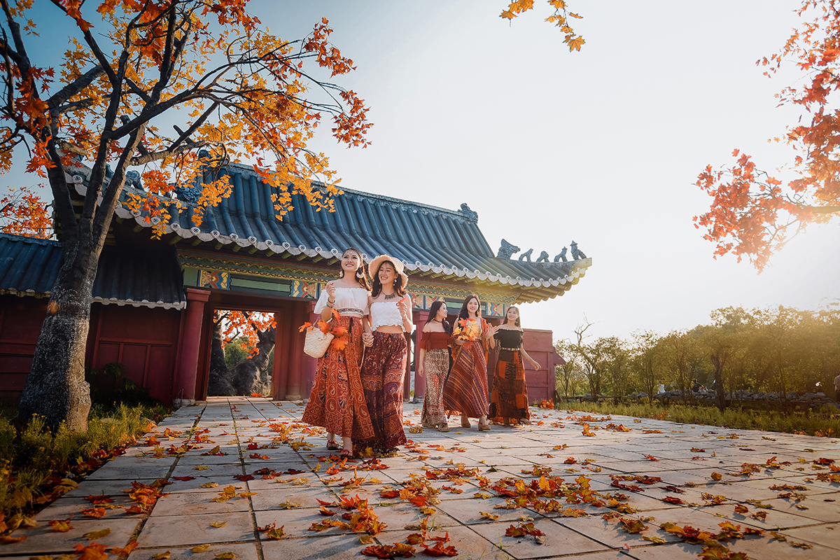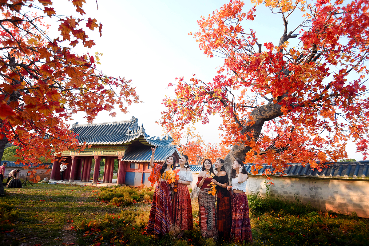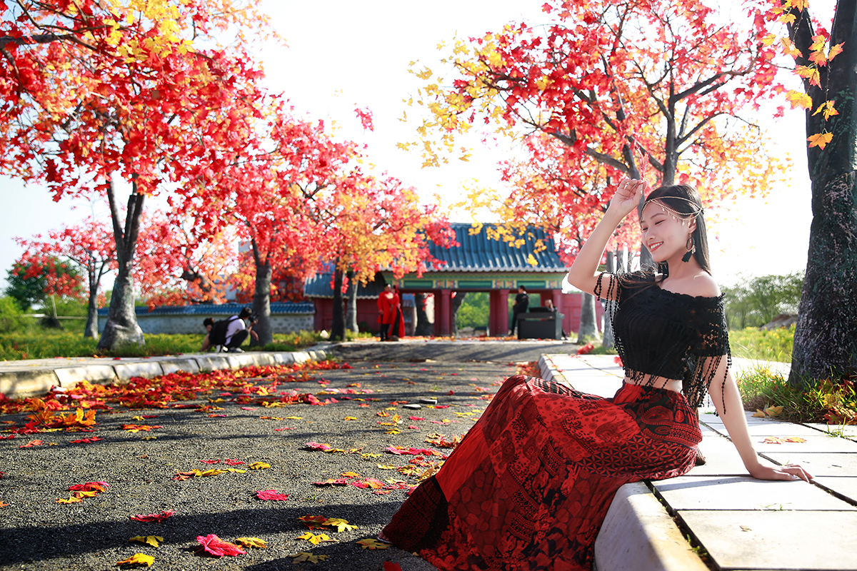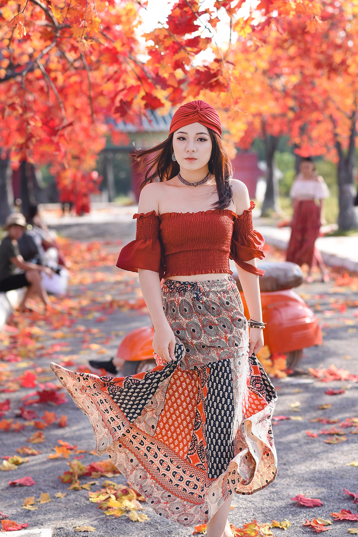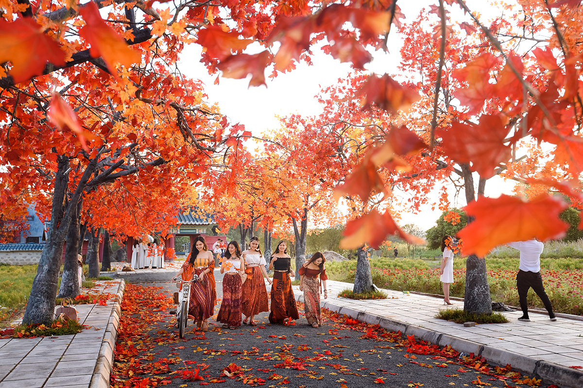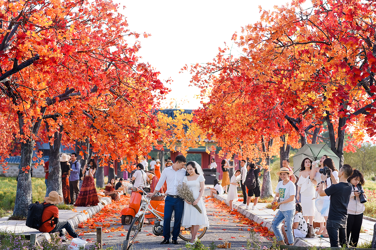 Sắc vàng đỏ của lá phong khiến bất kỳ ai đứng trong khuôn hình cũng tràn đầy cảm xúc lãng mạn.