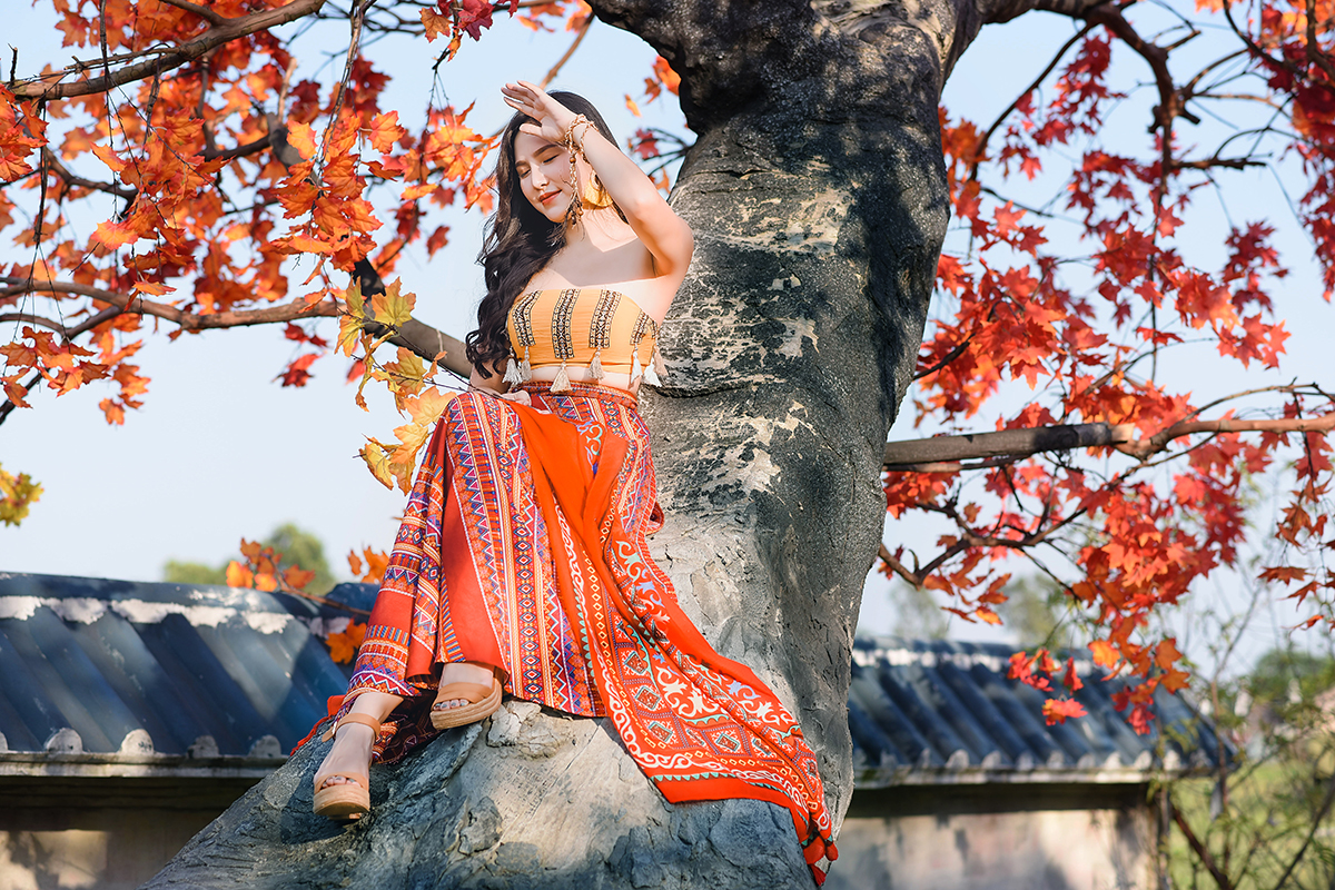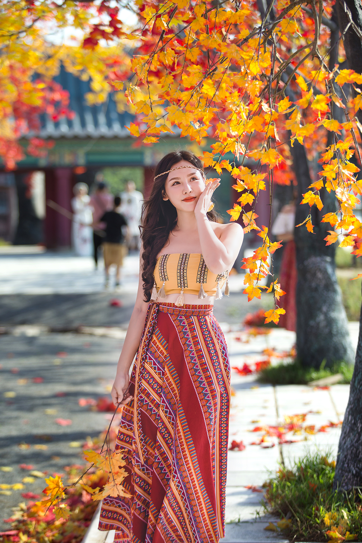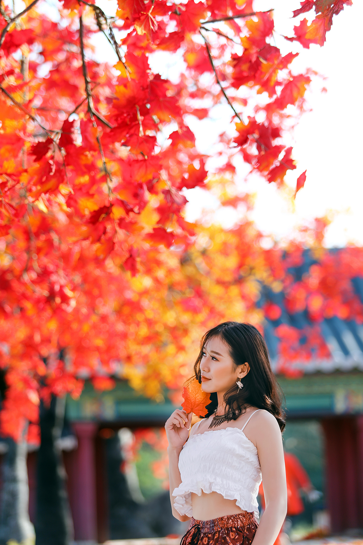 Thiếu nữ tạo dáng bên gốc phong khiến hình ảnh lãng mạn hơn.
