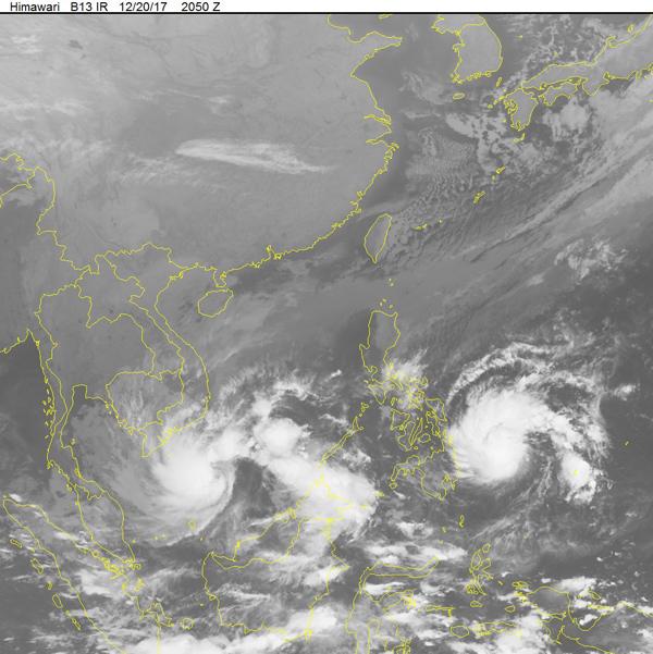 Hình ảnh bão số 15 và cơn bão Tembin trên ảnh mây vệ tinh. Ảnh: NCHMF