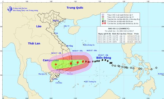 Tin từ Trung tâm Khí tượng Thủy văn Trung ương cho biết, vào lúc 19h hôm nay (3/10), vị trí tâm bão số 12 chỉ còn cách bờ biển Phú Yên-Khánh Hòa - Ninh Thuận khoảng 240km về phía Đông. Đến sáng sớm mai (4/11), bão sẽ chính thức đi vào đất liền các tỉnh từ Nam Phú Yên đến Bắc Bình Thuận. Bão gy ảnh hưởng lớn với sức gió mạnh nhất cấp 11-12, giật cấp 15. Cấp độ rủi ro thiên tai bão: cấp 3; riêng các tỉnh Phú Yên, Khánh Hòa, Ninh Thuận, rủi do tăng lên cấp 4.