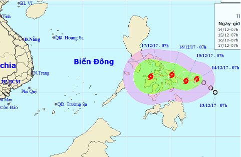 Trung tâm Dự báo khí tượng thủy văn Trung ương cho biết vào 7 giờ ngày 14-12, vị trí tâm bão Kai-tak ở vào khoảng 11,5 độ Vĩ Bắc; 127,9 độ Kinh Đông, cách bờ biển miền Trung Philippines khoảng 270 km về phía Đông. Sức gió mạnh nhất ở vùng gần tâm bão mạnh cấp 8 (60-75 km/giờ), giật cấp 10.