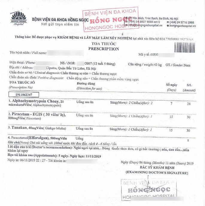 Chị Yến sau đó trình báo sự việc lên Công an phường Xuân Đỉnh. Công an lấy lời khai của các bên liên quan và yêu cầu đưa cháu N.A đi giám định. Gia đình đưa cháu đi chụp cộng hưởng từ, chụp X-quang, khám ngoại tại Bệnh viện Hồng Ngọc ngay trong đêm, kết quả là cháu bị chấn thương sọ não, chấn thương ngực, chấn động não, chấn thương phần mềm vùng ngực.