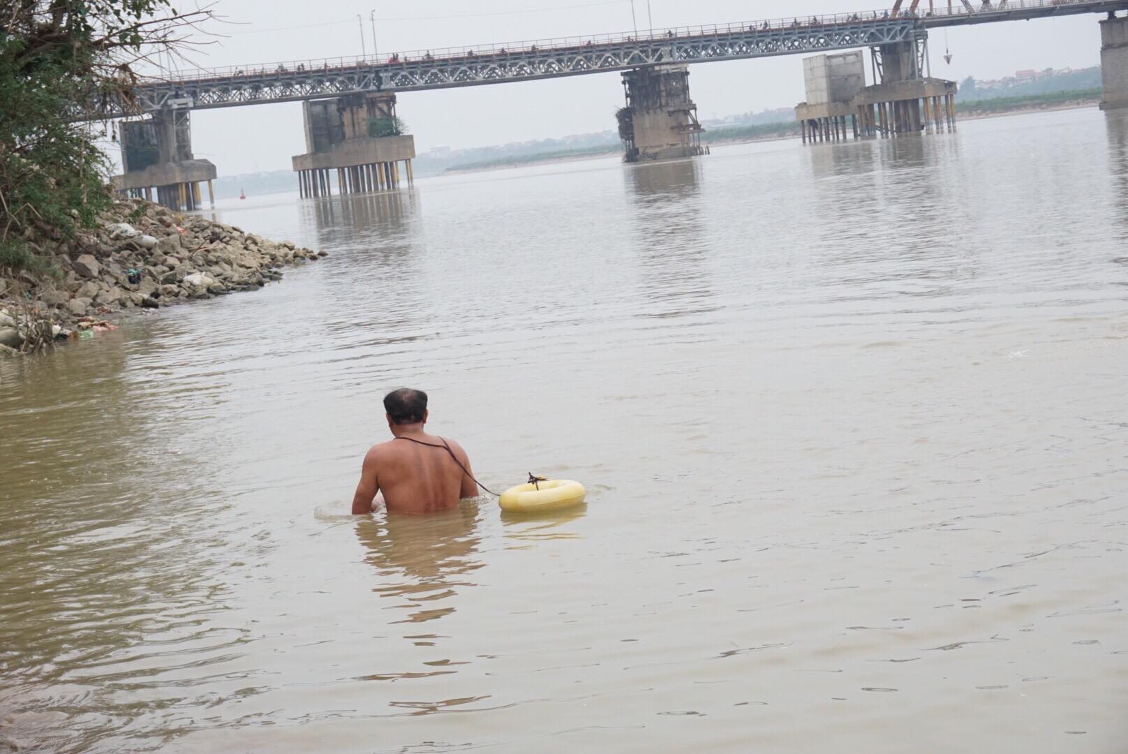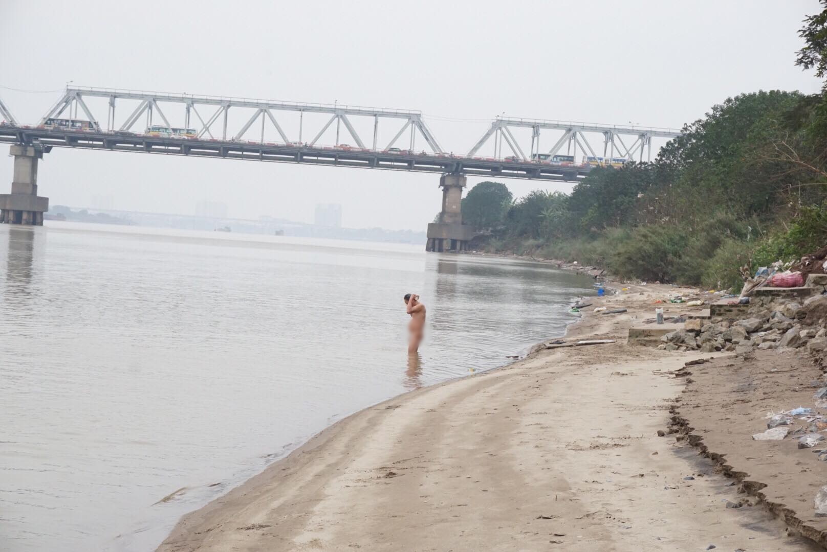 Bên dưới nhiều người thản nhiên tắm tiên, cách đó không xa là khu vực cầu Chương Dương, nơi nhiều người dân đi lại.