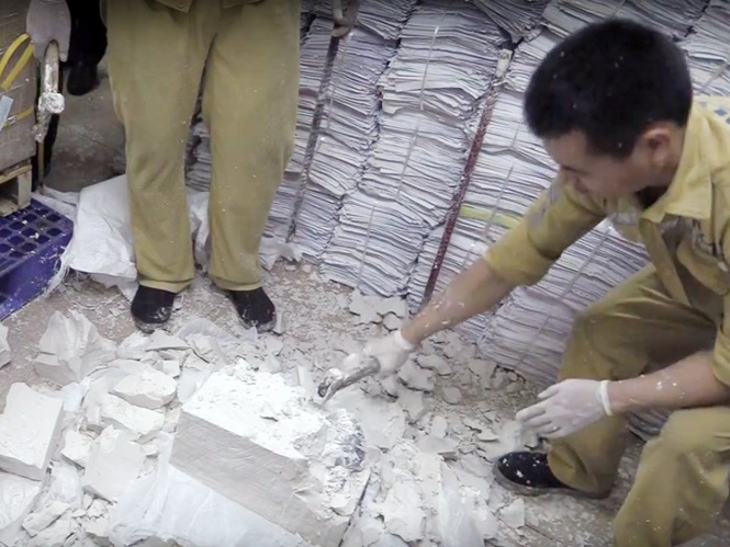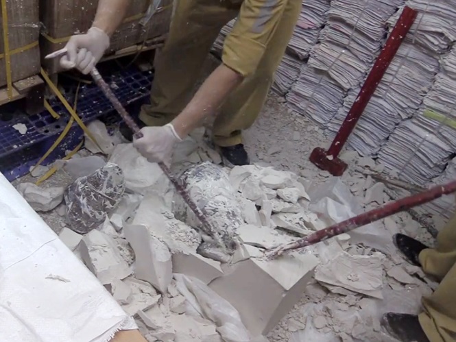Để tìm tang vật, lực lượng chức năng phải đục các khối thạch cao ra để lấy sừng tê giác được giấu bên trong.
