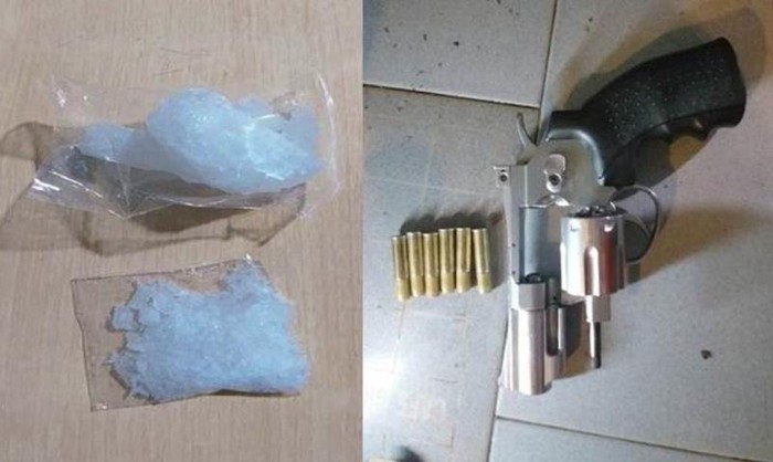 Cơ quan công an thu giữ tang vật gồm 13 gói nylon chứa nhiều tinh thể màu trắng, trọng lượng 184 gam (nghi là ma túy đá). Khám xét trên người, xe máy của các nghi phạm, cảnh sát phát hiện khẩu súng khắn, khẩu súng cồn, cân điện tử và 37 triệu đồng.