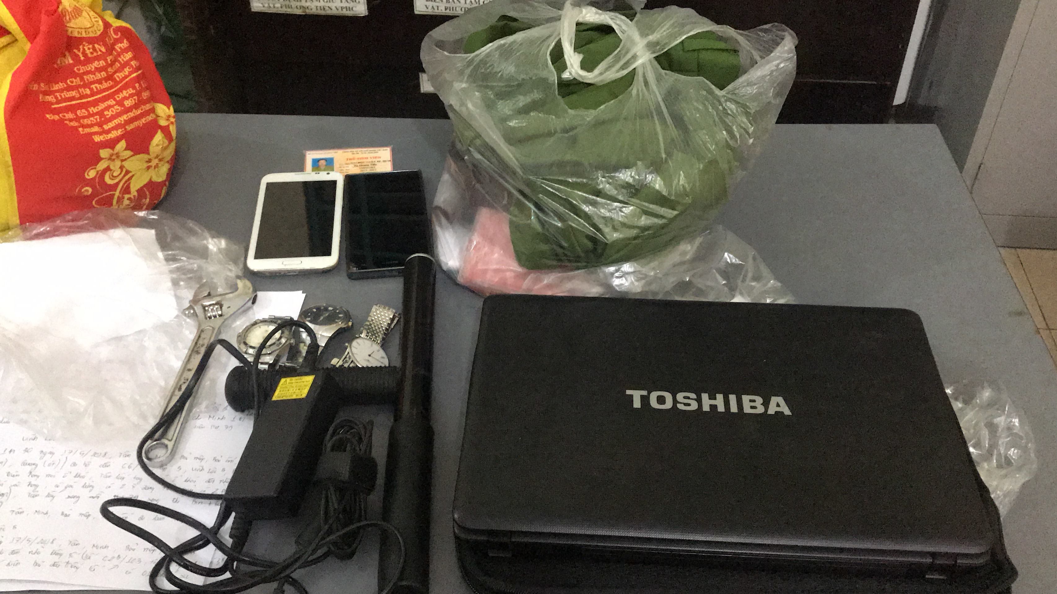 Tại thời điểm kiểm tra, tang vật Công an thu giữ là ĐTDĐ, dao, bộ quân phục CAND, còng số 8, bảng tên CAND mang tên T.Q.T. Tiến hành tra hỏi, nhóm trộm khai nhận những tang vật này chúng vừa trộm được. Từ 0h đến 5h rạng sáng 17/5 đã thực hiện 4 vụ trộm gồm: 3 vụ ở huyện Bình Chánh và 1 vụ ở quận Bình Tân.