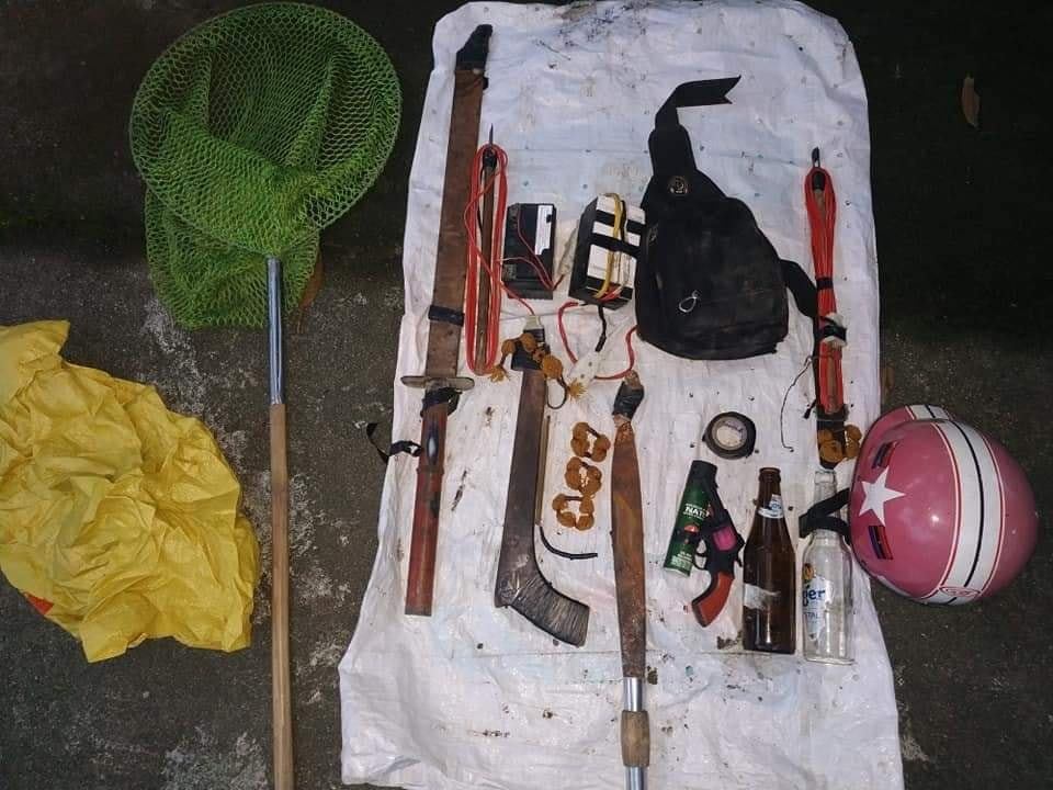 Tang vật thu giữ tại chỗ gồm 8 con chó các loại có tổng trọng lượng 107 kg, 3 chiếc xe máy cùng các dụng cụ mà các đối tượng dùng để câu trộm chó như: 3 chiếc kiếm tự chế, 4 súng bắn điện tự chế được nối với ắc quy xe máy để bắn chó và người, 2 vợt để vợt chó mèo, 1 súng bắn bi, 10 bao bì để đựng chó.