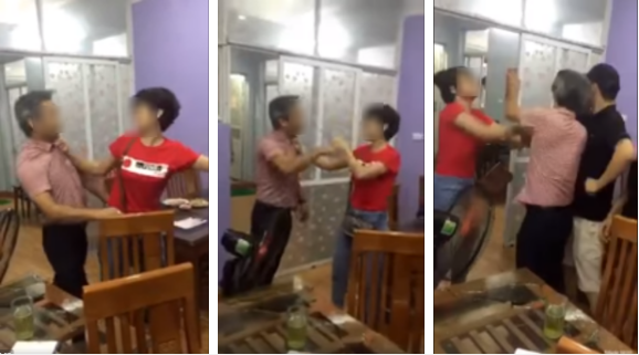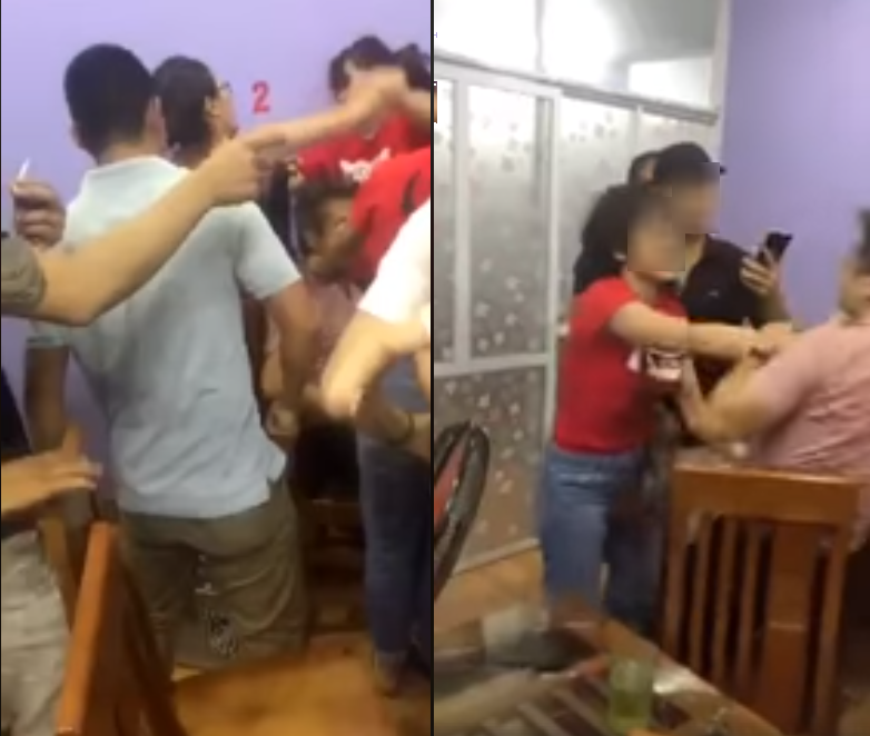 Theo đó, hình ảnh trong đoạn clip ngắn ghi lại cho thấy, ngay khi xông vào chứng kiến sự việc, những người đi cùng chị vợ (tóc ngắn, áo đỏ, đeo kính) đã xông vào túm áo cô nhân tình đồng thời phá hỏng bữa ăn. Riêng chị vợ túm cổ áo chồng chửi bới và chì chiết thậm tệ: “Chúng mày phè phỡn thế này đây à?”.