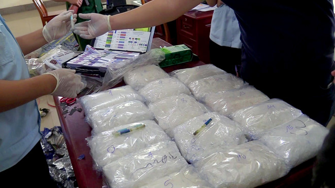 Qua kiểm tra, lực lượng chức năng phát hiện 16 gói nylon (15 gói nylon màu trắng và một gói nylon màu xanh) với trọng lượng khoảng hơn 15 kg, bên trong có chứa chất tinh thể màu trắng nghi là ma túy đá, được giấu rất kỹ trong khoang hành lý.