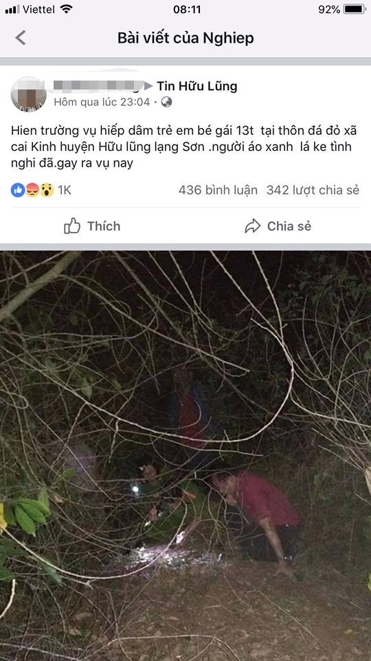 Tối 26/4, trên mạng xã hội, một người chia sẻ thông tin, tại xã Cai Kinh, huyện Hữu Lung, tỉnh Lạng Sơn xảy ra vụ việc bé gái 13 tuổi bị một đối tượng hiếp dâm. Kèm theo thông tin trên là ảnh một người đàn ông được cho là nghi phạm và hình ảnh cảnh sát đang khám nghiệm hiện trường nơi xảy ra sự việc.