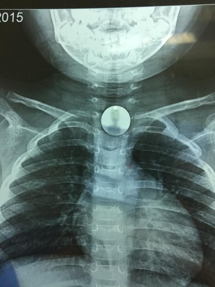 Hình ảnh đồng xu chắn ngang cuống họng bé K qua chụp Xquang.