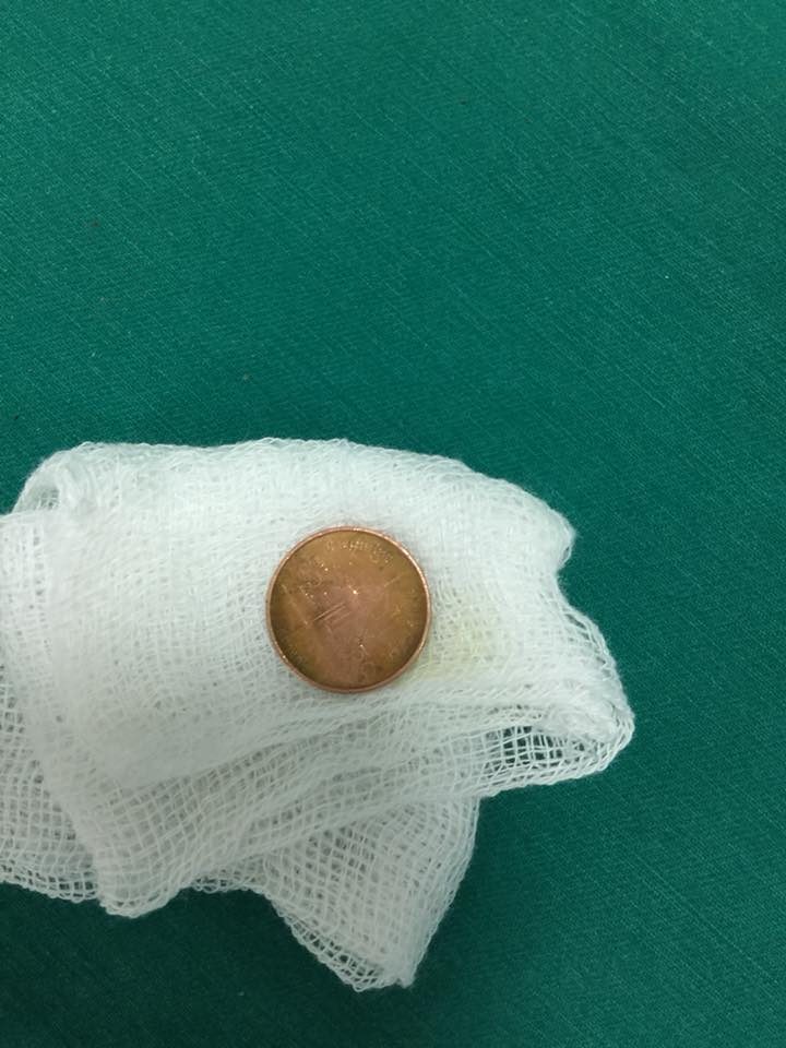 Sau khi có kết quả chụp Xquang, bé K được các bác sĩ chỉ định tiến hành nội soi gắp dị vật ra. Chiếc đồng xu đang mặc kẹt trong họng bé K đã được bác sĩ Vũ Huy Hiền - Trưởng khoa Thăm dò chức năng lấy ra nên không ảnh hưởng đến sức khoẻ, tính mạng.