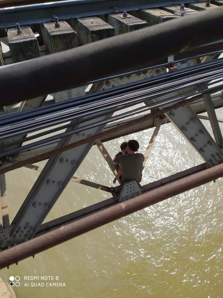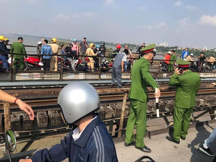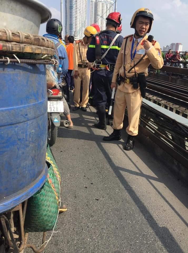 Lúc này, người thanh niên đang ôm con nhỏ khóc rất to ngồi ở thanh ngang cầu Long Biên phía dưới là lòng sông Hồng có biểu hiện chỉ muốn nhảy xuống. Lúc này hai cảnh sát vừa làm nhiệm vụ phân luồng để tránh đám đông hiếu kỳ tụ tập tổ công tác cũng làm những biện pháp ban đầu trò chuyện, khuyên can để đối tượng không làm điều dại dột.