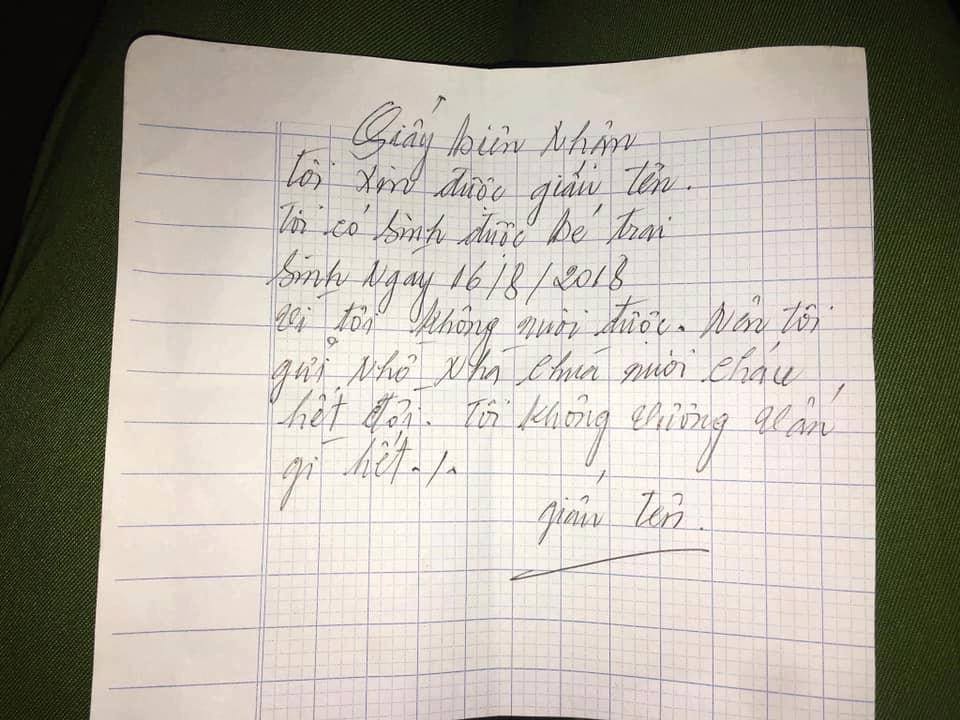 Đặc biệt, nhà chùa còn thấy một mảnh giấy do người mẹ viết để lại có nội dung: “Giấy biên nhận! Tôi xin được giấu tên, tôi có sinh được một bé trai, sinh ngày 26/8/2018. Vì tôi không nuôi được nên tôi gửi nhờ nhà chùa nuôi cháu hết đời, tôi không vương vấn gì hết”.