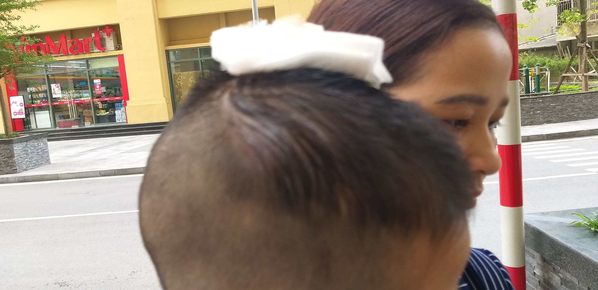 “Khi rơi xuống cán chổi đập vào đỉnh đầu cháu tôi gây chảy máu nhiều. Thấy vậy tôi hốt hoảng hô mọi người đến ứng cứu và đưa vào quầy thuốc nhờ sơ cứu”, bà D. kể lại.