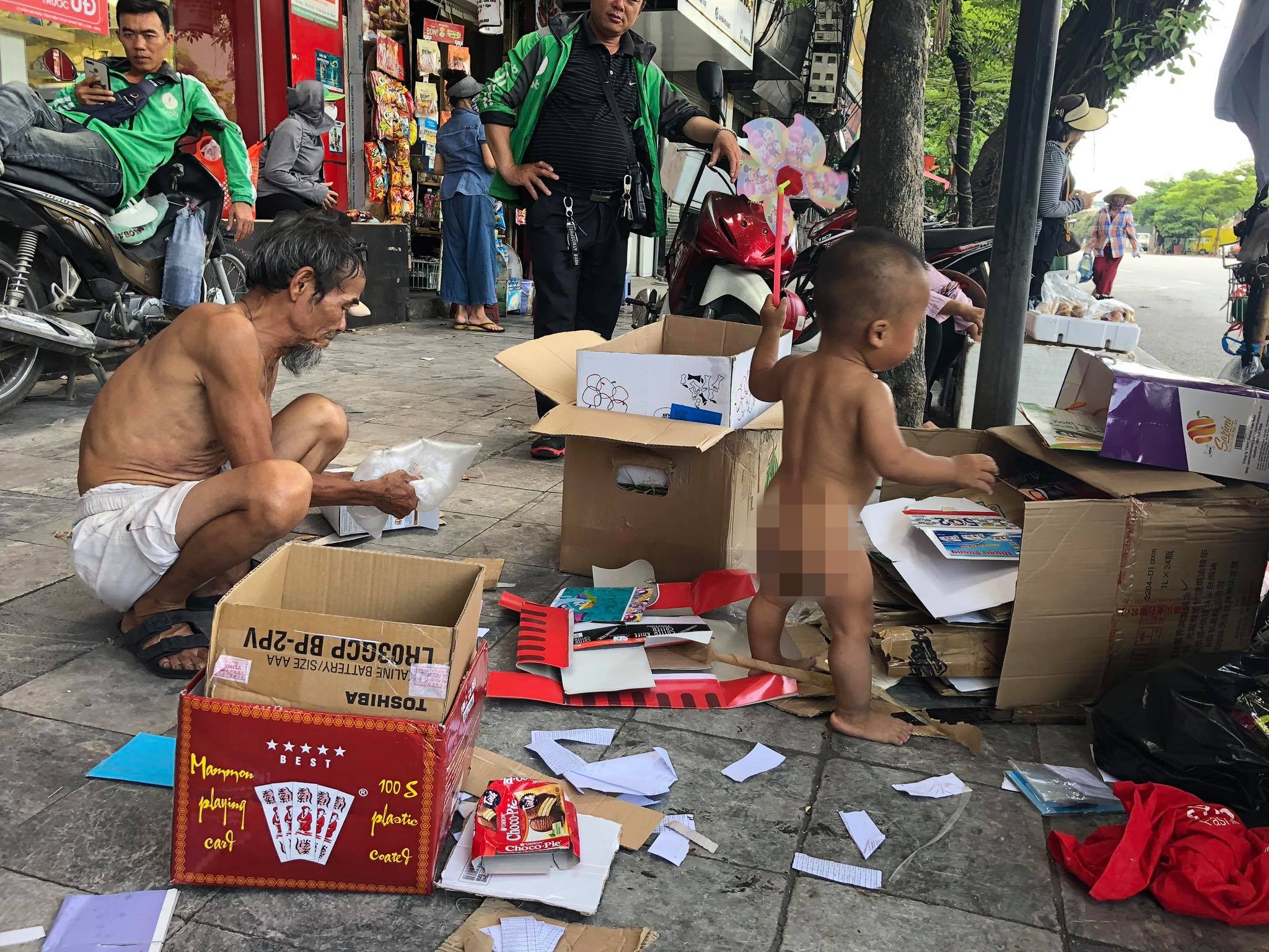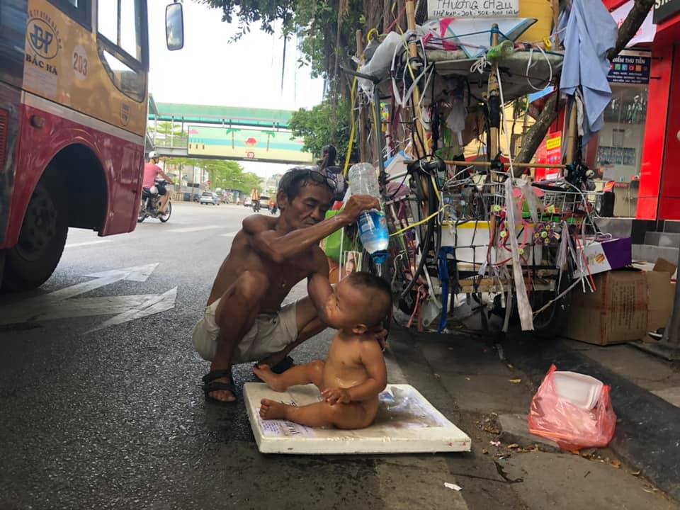 Trước đó, mạng xã hội Facebook xuất hiện hình ảnh bé trai 18 tháng tuổi trần truồng cùng một người đàn ông xuống phố Hà Nội mưu sinh trong cái nắng hè gay gắt.