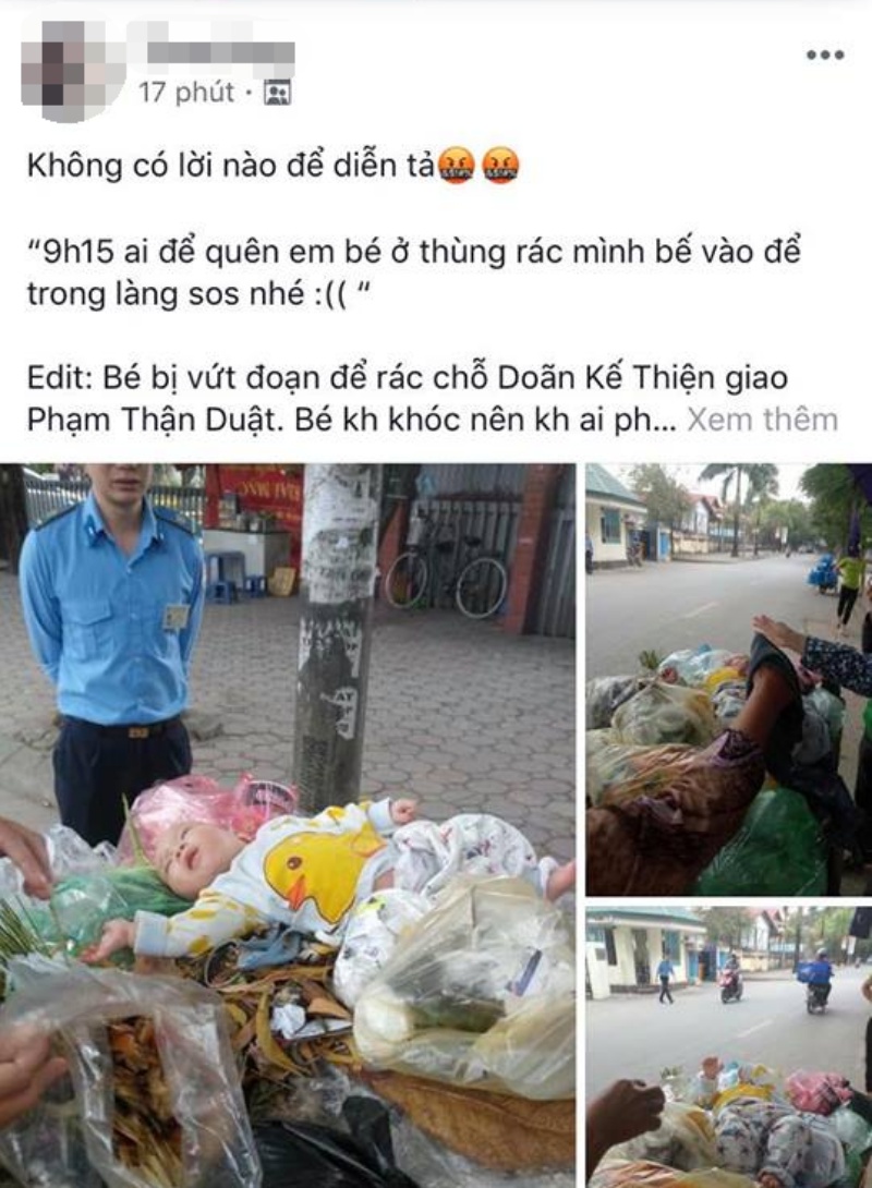 Sáng 5/12 trên mạng xã hội lan truyền hình ảnh một cháu bé khoảng 4,5 tháng bị bỏ rơi trong thùng rác trên đường Phạm Thận Duật (cạnh làng trẻ em SOS Hà Nội), quận Cầu Giấy, Hà Nội. Theo đó, qua hình ảnh nhìn rõ cháu bé nằm trên đống rác đang bốc mùi, bé không đi tất chân tất tay cũng như không giấy tờ tuỳ thân.