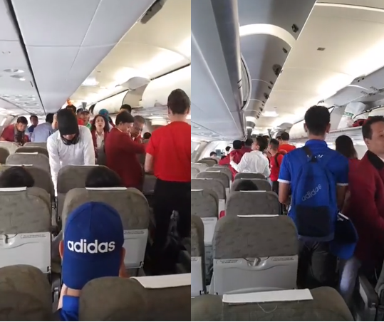 Các cầu thủ và đoàn thể thao Việt nam đang ổn định vị trí trước khi máy bay cất cánh rời Indonesia.