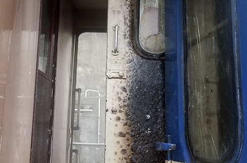 Kính vỡ, cửa ở toa 3 bị ám khói đen sau vụ hỏa hoạn. Ảnh: Nguyễn Đông.