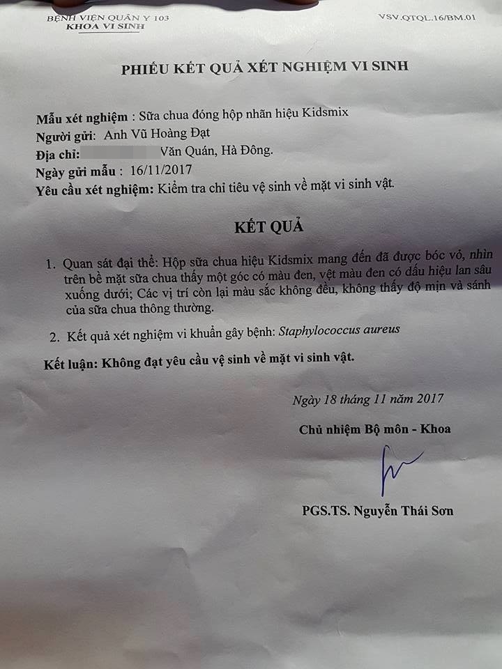 Kết quả khám nghiệm vi sinh tại BV này cho thấy: “Trên bề mặt hộp sữa chua hiệu Kidsmix có một góc màu đen, vệt màu đen có dấu hiệu lan sâu xuống dưới các vị trí khác có màu sắc không đều, không thấy độ mịn và sáng của sữa chua bình thường. Kết luận, không đạt yêu cầu vệ sinh bề mặt vi sinh vật”.