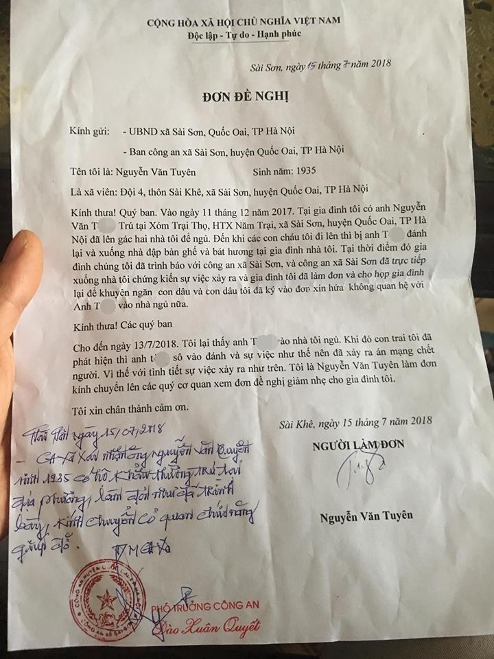 Gia đình ông Tuyên làm đơn trình bày về việc bắt gặp anh T. nhiều lần ngủ qua đêm tại nhà con trai mình mới mất.