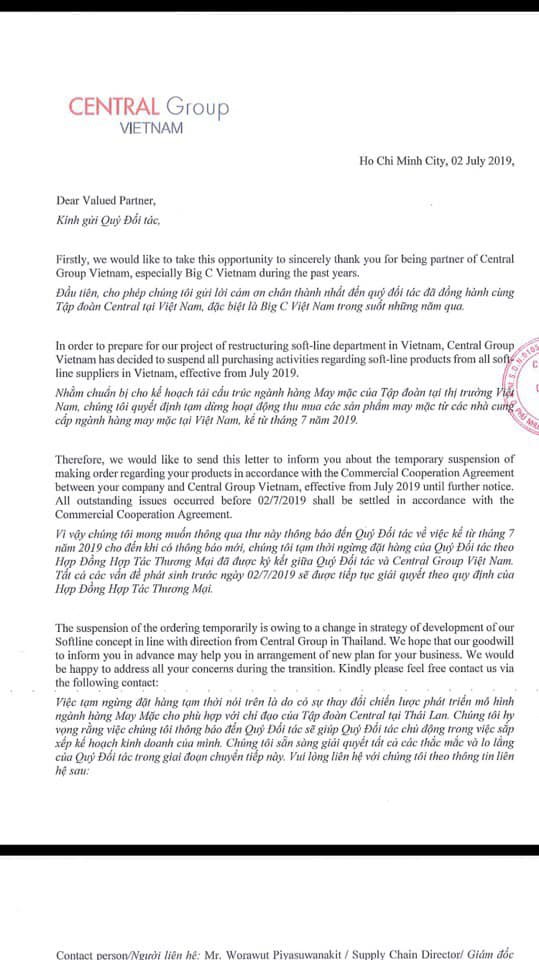 “Kể từ tháng 7 cho đến khi có thông báo mới, chúng tôi sẽ tạm thời ngừng đặt hàng của đối tác theo Hợp đồng Hợp tác Thương mại ký kết giữa đối tác và Central Group Việt Nam”, thông báo của Central nêu rõ.