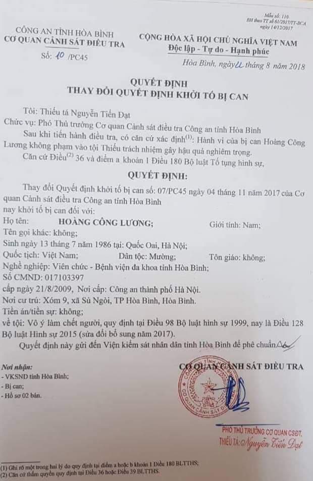 Liên quan đến vụ án chạy thận làm 9 người tử vong xảy ra tại Bệnh viện đa khoa tỉnh Hòa Bình hồi tháng 5/2017, thông tin từ Cơ quan cảnh sát điều tra Công an tỉnh Hoà Bình cho biết, ngày 24/8, đơn vị này đã ra thay đổi quyết định khởi tố bị can đối với Hoàng Công Lương từ tội “Thiếu trách nhiệm gây hậu quả nghiêm trọng” tại số 07/PC45 ngày 4/11/2017 thay đổi thành tội “Vô ý làm chết người” quy định tại Điều 98 BLHS 1999, nay là điều 128 BLHS 2015 (sửa đổi bổ sung năm 2017).