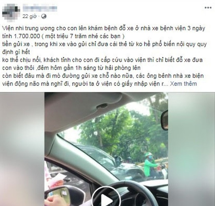 Ngày 1/9, trên mạng xã hội lan truyền clip do chủ tài khoản là P.L., ở Hải Phòng đăng tải về việc phải chi trả hết 1 triệu 750 nghìn đồng tiền gửi xe ô tô 3 ngày trong bãi xe bệnh viện Nhi Trung Ương.