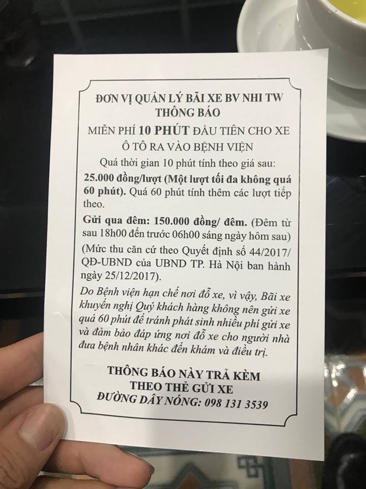 “Chúng tôi đã thông báo cụ thể trên thẻ giữ xe của khách, trên bảng thông tin tại bãi xe và có cả tờ rơi gửi cho khách để thông báo công khai tình hình bệnh viện hạn chế nơi đỗ xe. Vì vậy, bãi xe khuyến nghị quý khách hàng không nên gửi xe quá 60 phút để tránh phát sinh nhiều phí gửi xe và đảm bảo đáp ứng nơi đỗ xe cho người nhà đưa bệnh nhân khác đến khám và điều trị.