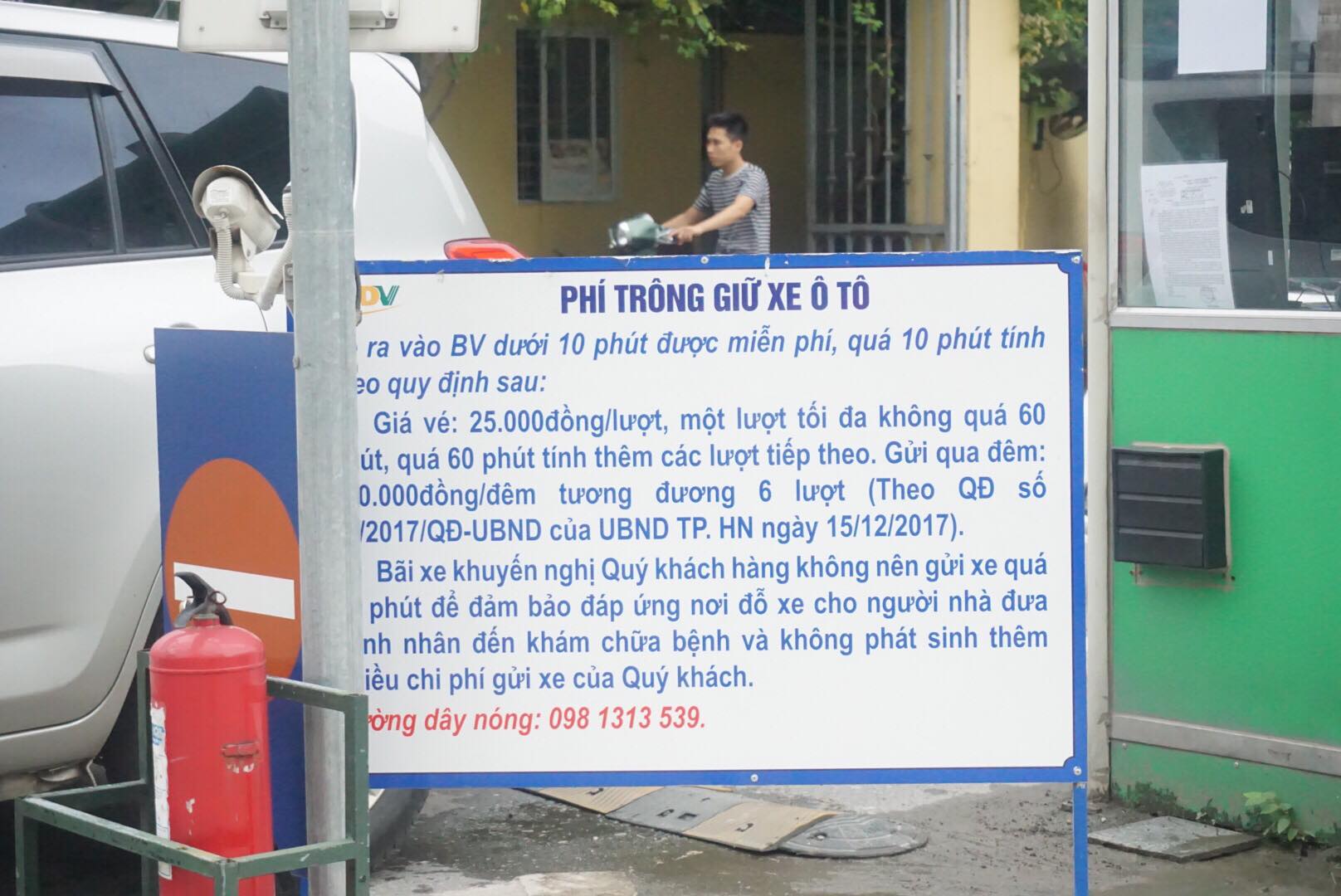 Theo ông Dũng, khách vào lúc 22 giờ 54 phút ngày 27/8 ra lúc 15 giờ 57 phút ngày 31/8. Trước khi vào gửi xe, nhân viên bảo vệ đã đưa thẻ và một tờ giấy ghi rõ thông tư hướng dẫn miễn phí 10 phút đầu không phải trả phí với tất cả người nhà dùng xe ô tô, xe máy chở người bệnh vào bệnh viện. Nếu sau 10 phút thì người nhà bệnh nhân phải đóng tiền phí trả xe theo quy định.