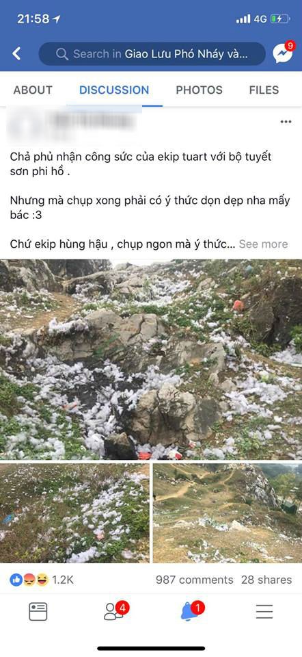 Tài khoản T.T.N viết: “Không phủ nhận công sức của ekip Tuart trong bộ “Tuyết sơn phi hồ” nhưng chụp xong phải có ý thức dọn dẹp chứ mấy bác. Ekip chụp “ngon”, hùng hậu mà ý thức kém”, kèm với hình ảnh núi Trầm “chìm” trong rác.