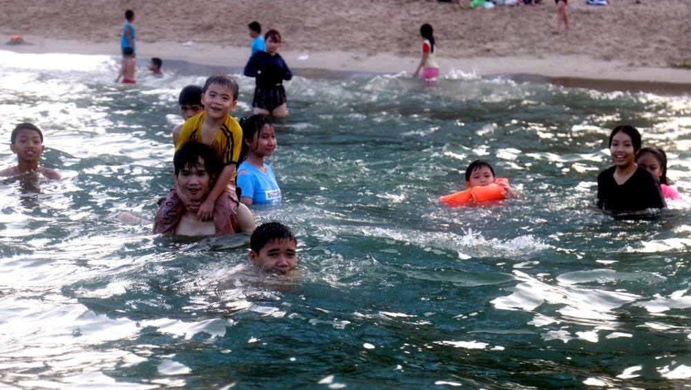 Chiều 30/4, nắng nóng gay gắt càng khiến nhiều người thích thú nhảy xuống nước. Tại những khu vực cắm cờ cảnh báo nguy hiểm du khách cũng không ngần ngại tới vùng vẫy khi mực nước chưa lên cao.