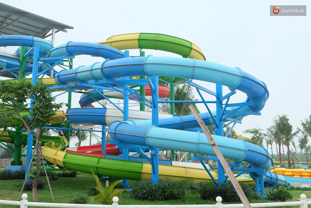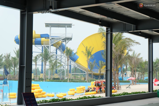 Khu vui chơi, tắm biển ngoài trời vắng vẻ, chỉ còn lại một số công nhân đang dọn dẹp xung quanh.