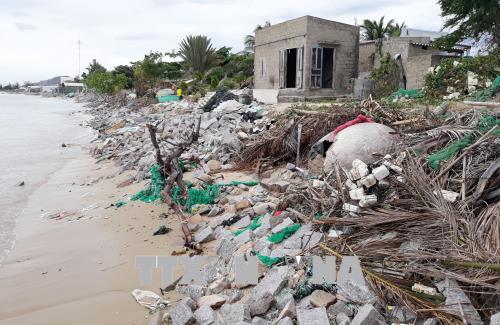 Nước biển xâm thực gây sạt lở bờ ở thôn Khánh Nhơn 1, xã Nhơn Hải. Ảnh: Nguyễn Thành/TTXVN.