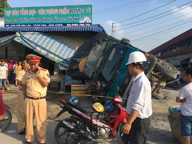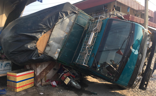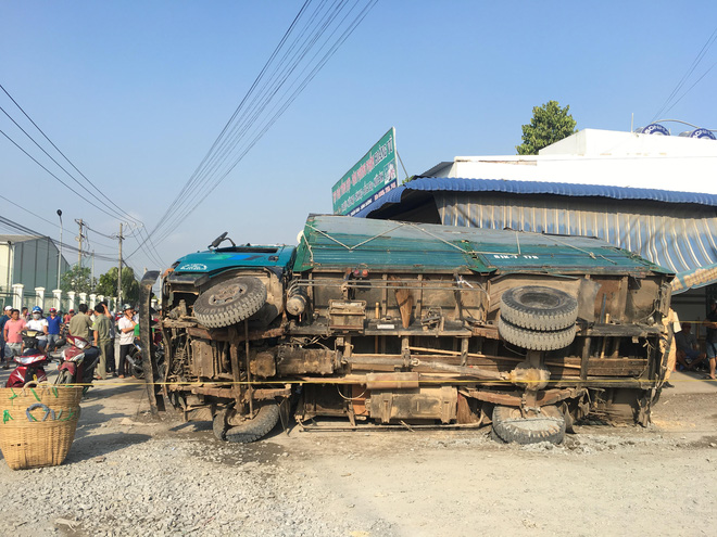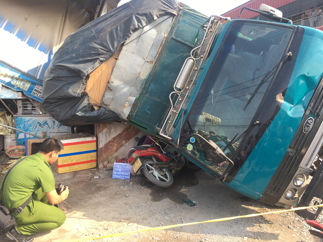 Do bị sụt bánh khiến xe lật nghiêng về 1 bên đổ vào quán tạp hóa bên đường. Đúng lúc này cô gái Lê Thị Mai T (27 tuổi, quê An Giang) đang đứng mua nước mía không chạy kịp bị cả xe đè vào người chết tại chỗ.